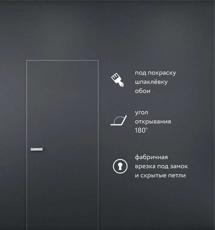 Дверь, которая растворяется в интерьере. INVISIBLE — это ультрасовременное решение для интерьеров в стиле минимализм. Дверное полотно толщиной 40 мм с алюминиевой кромкой и специальная конструкция короба позволяют полностью скрыть дверь в стене, создавая эффект "невидимости". Поставляется в белом грунте, готова к покраске в цвет стен. В комплекте — алюминиевый короб с уплотнителем, скрытые петли и магнитный замок.